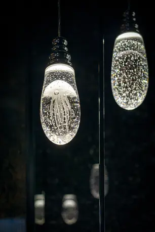 The open-plan living room and kitchen area is stylish yet functional. Oak countertops add warmth to the modern built-in kitchen, while dramatic ceiling lighting gives the space a refined, cohesive atmosphere.