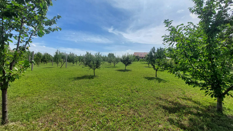 The well-maintained orchard features quince, apricot, peach, pear, plum, sour cherry, raspberry, black raspberry, loganberry, cornelian cherry, and hairy cherry trees. The trees are equipped with a drip irrigation system.